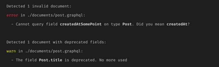 In order to find out that your operation or fragment is broken you need to run an app and execute a query or mutation. Thanks to GraphQL Inspector, you can easily check for errors or deprecated usage at any point of time.